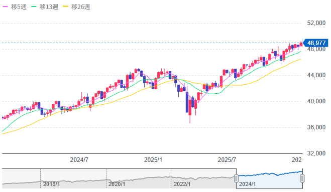 2024年1月の最初の終値は、37,715ドル。2025年12月31日の終値は 48,063ドル です。2年間で約27%上昇上昇しました。