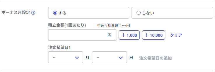 ボーナス月設定を「する」を選択し、「積立金額」「注文希望日」を入力し設定は完了です。