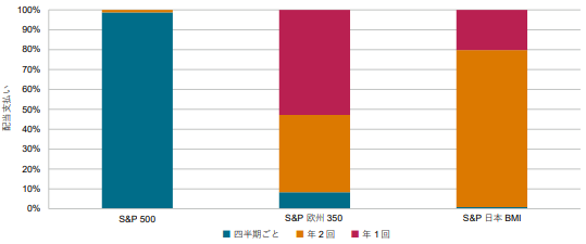 米国市場は長い歴史の中で配当文化が根付いており、配当の支払い頻度が他の主要市場と大きく異なります。欧州では年1回、日本では年2回の配当が一般的ですが、米国では四半期ごとの配当支払いが主流です。2023年に配当を支払ったS&P500企業の約99%が四半期配当を実施しており、安定的かつ継続的に株主へ還元する姿勢が特徴となっています。この点が米国株の魅力の一つです。