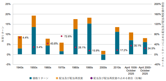 以下のグラフはS&P500の年率のトータルリターンです。配当は 1936 年 ~ 2025 年間でS&P500の株式トータル・リターンの 35%を占めており、3 分の 1 以上を占めています。残りの 3 分の 2 は元本の上昇分です。